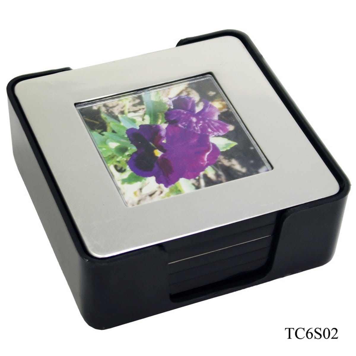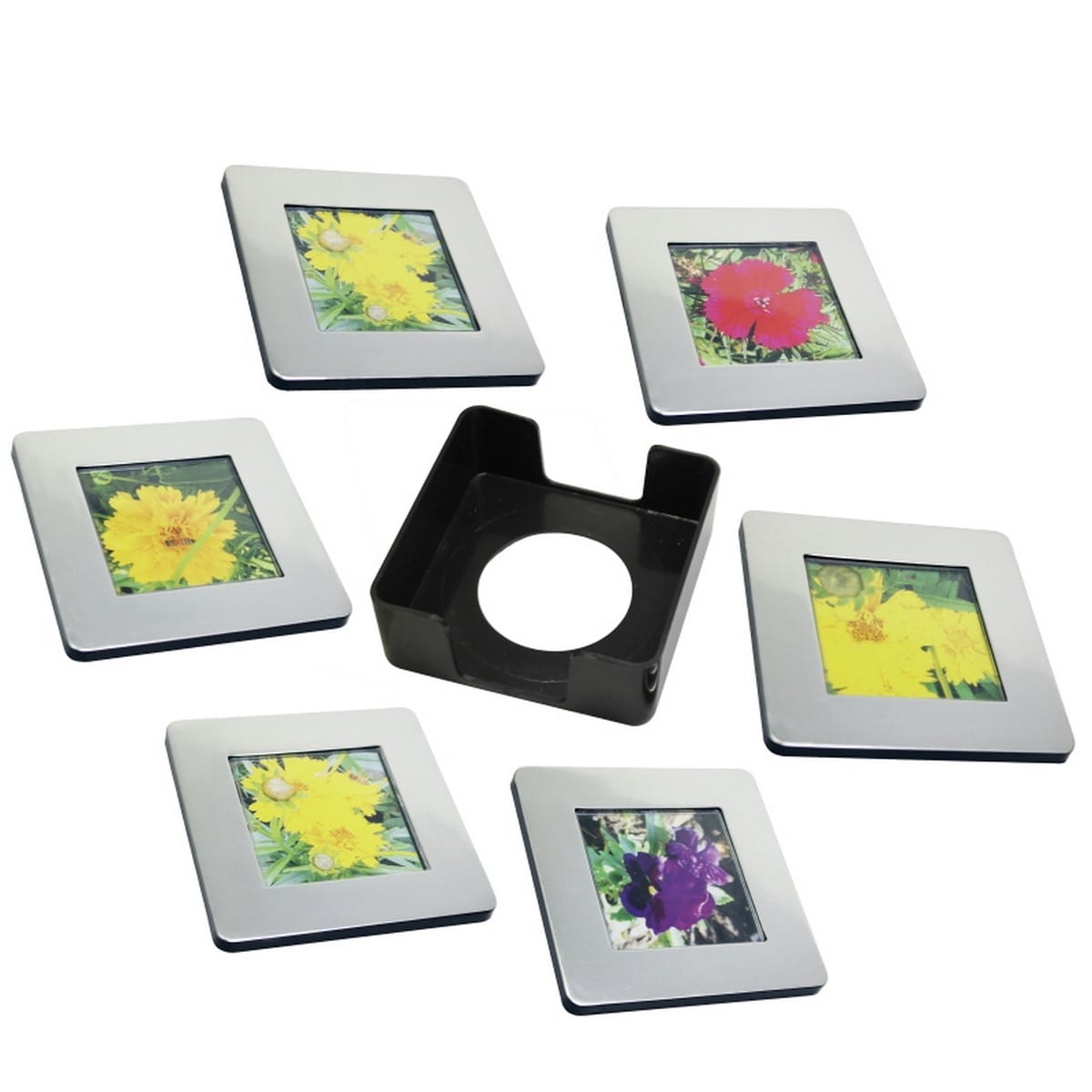 • Elevate your corporate setting with our set of six square silver tea coasters.